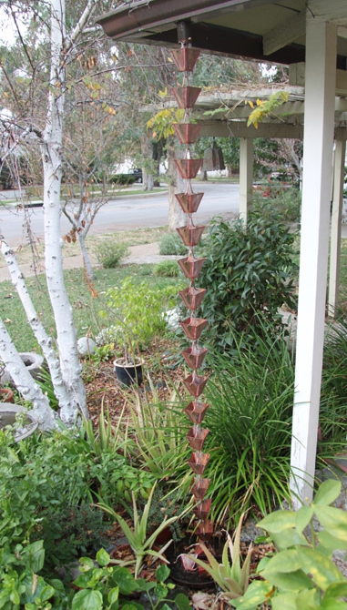 An exclusive addition to our aged square cups designs. This Medium square cup adds a distinctive “slotted” cutout design. Made of pure copper, with a folded lip along the top for stiffness, each cup is individually welded together by hand. The heat of the torch adds the unique coloration (aging effect); this is not a chemical coating or paint. This chain looks a hundred years old right out of the box! Will easily handle heavy rain.